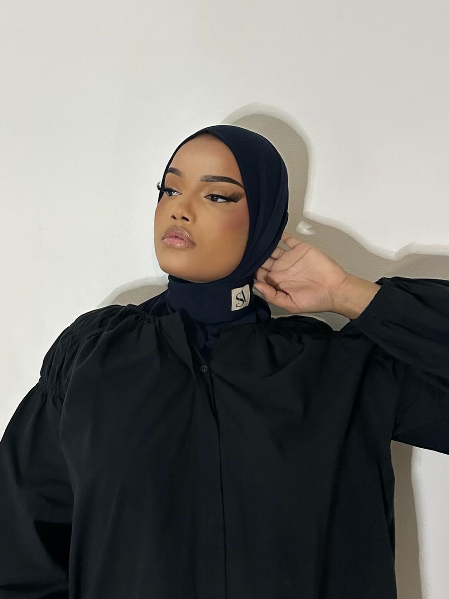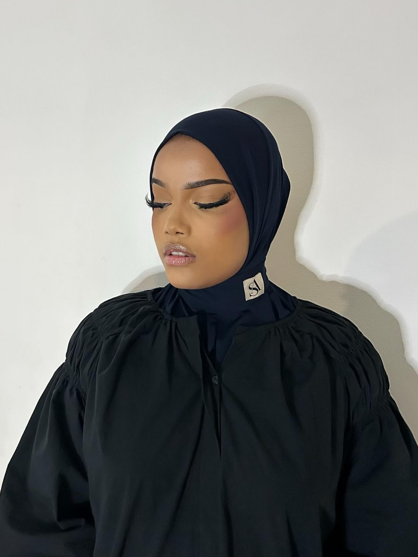 Hijab prêt à enfiler – Bleu nuit étiquette beige
